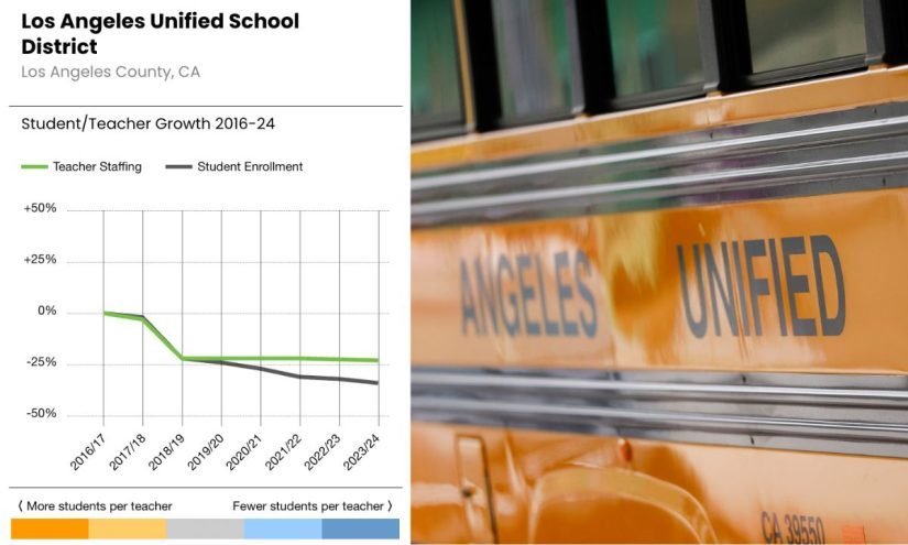 Effectively, Los Angeles reduced its student/teacher ratio over this time period from 22.5 to 19.3 students per teacher. As The 74 reported earlier this year, about three-quarters of districts across the country have reduced their student/teacher ratios in similar ways over the last few years, but Los Angeles had one of the bigger drops.