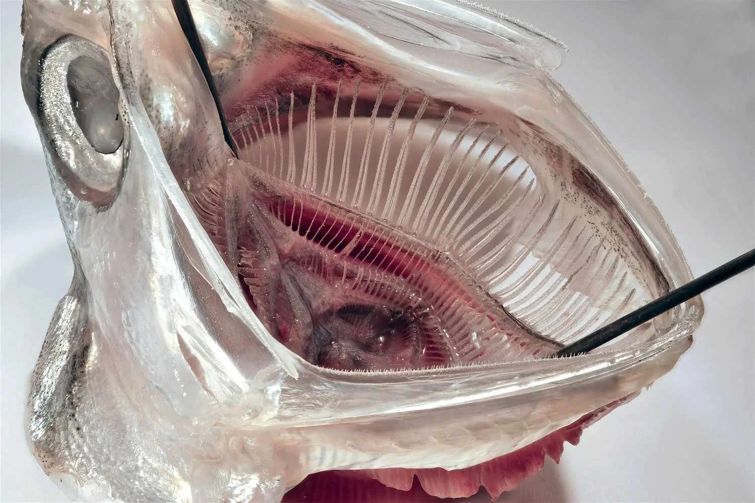 “During food intake, the water flows through the permeable funnel wall, is filtered, and the particle-free water is then released back into the environment via the gills,” Blanke explained. “However, the plankton is too big for this; it is held back by the natural sieve structure. Thanks to the funnel shape, it then rolls toward the gullet, where it is collected until the fish swallows, which empties and cleans the system.”