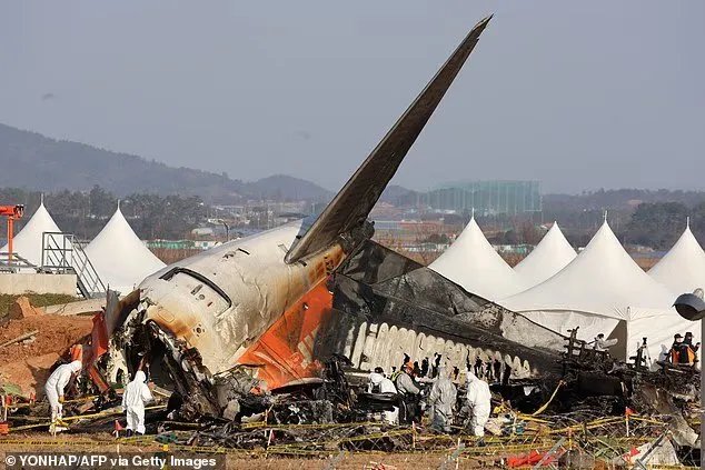 The past year has seen an apparent spike in commercial plane crashes, resulting in the loss of hundreds of lives. Pictured: The wreckage of the Jeju Air Boeing 737 after it crashed at Muan International Airport on January 1