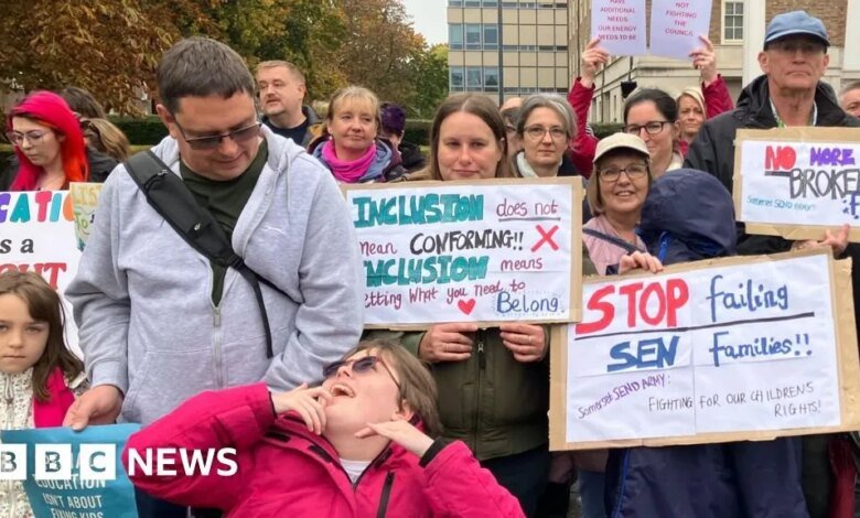 than 50 parents and children gathered outside County Hall in Taunton, Somerset, angry about the authority’s Send service which they said was failing their children,and leaving parents “exhausted”.