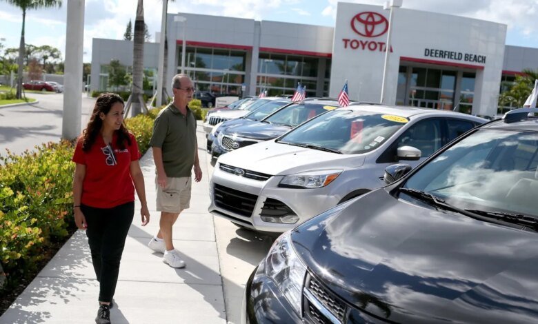 A salesperson (left) shows vehicles to a shopper at a Toyota dealership.