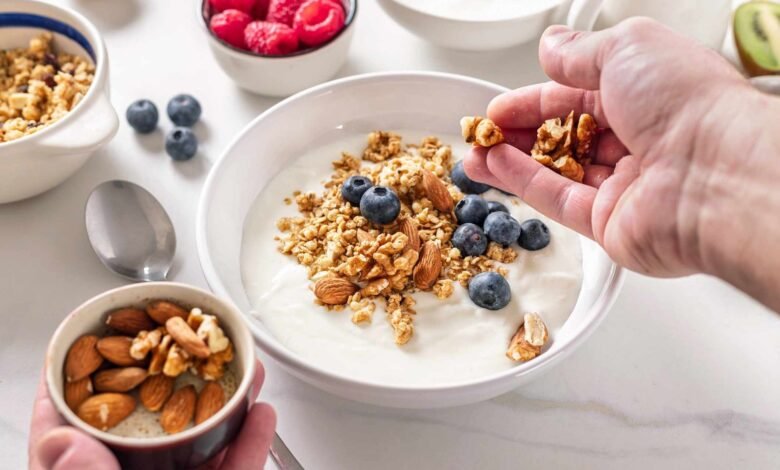• How to enjoy it: Cottage cheese pairs well with both sweet and savory foods. For a more delicious snack, top cottage cheese with salt, pepper, fresh herbs, and chopped veggies. If you’re craving something sweet, mix cottage cheese with berries, dark chocolate chipsand nuts for a balanced snack.