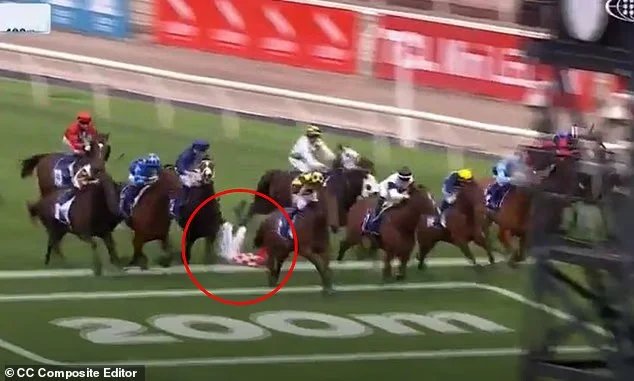 Paramedics immediately rushed to the aid of the 38-year-old Victoria-born jockey, as She’s Got Pizzazz continued to keep up with the pack.