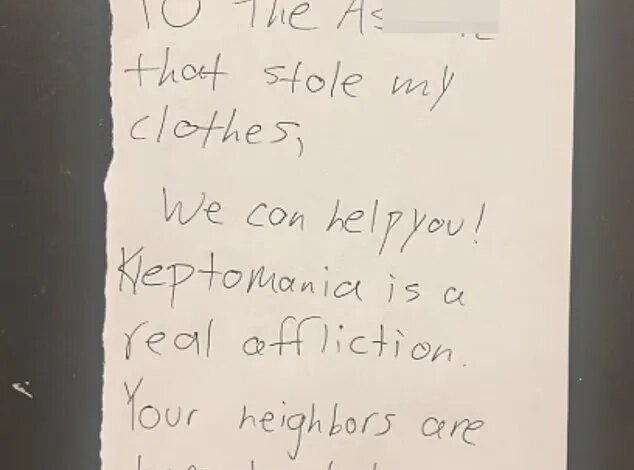 ‘To the a**hole that stole my clothes, we can help you! Kleptomania is a real affliction. Your neighbours are here to help.’