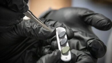 Three of the seven newly synthesized high-entropy oxide ceramic pellets are pictured here. Credit: David Kubarek/Penn State Penn State scientists…